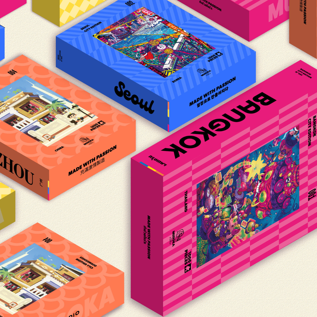 Feel the vibes of Asian cities in colorful puzzles! Designed by local artists, time to travel! 1000-piece puzzles.