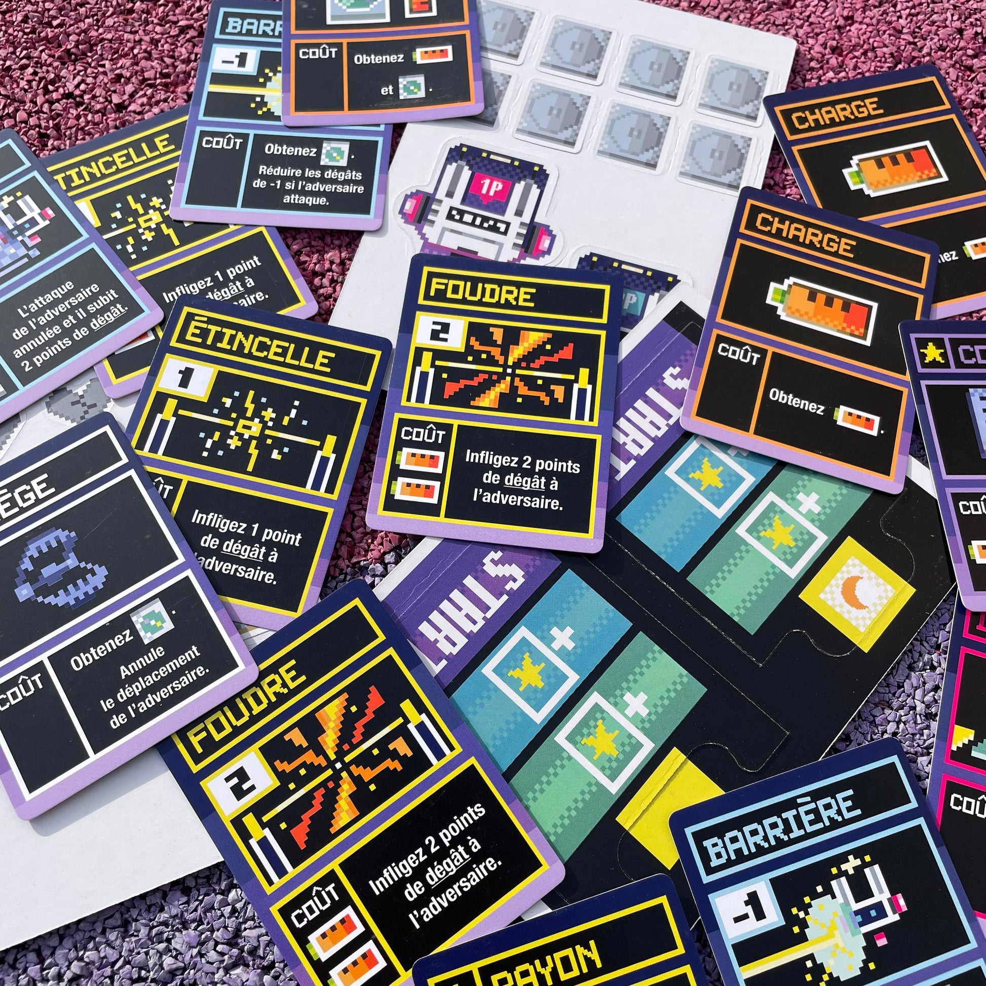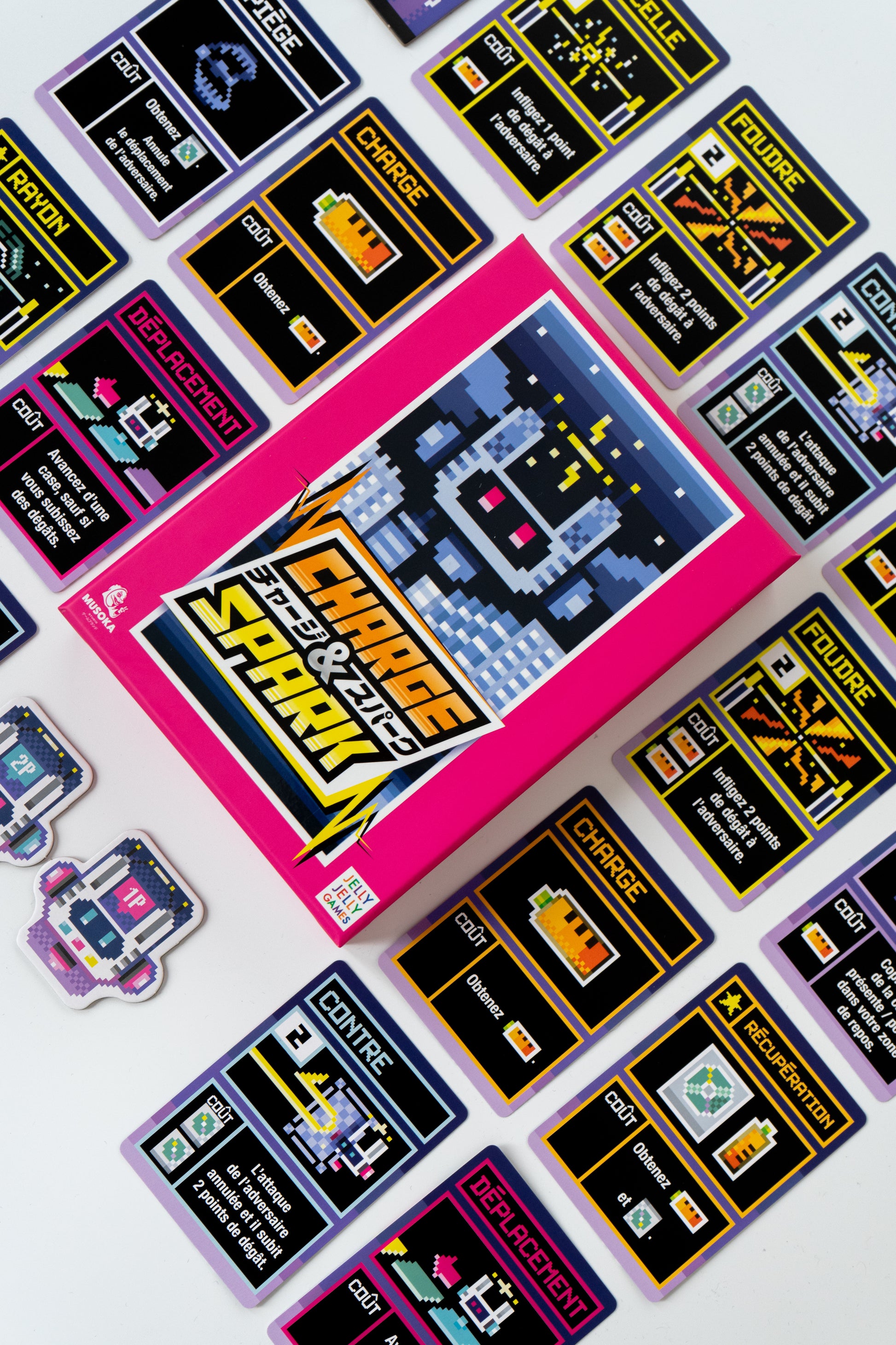 The year is 2083, in the town of Neo-Cyber-Setagaya. Humanity has long since disappeared, and the planet is now populated by androids. You have in your hands the latest board game to come out of this alternative future: a real-time strategic battle fought by robots. Give your robot orders by playing your basic cards (Lightning, Counter, Move, etc.) to try and win. The aim is simple: to become the ultimate robot!